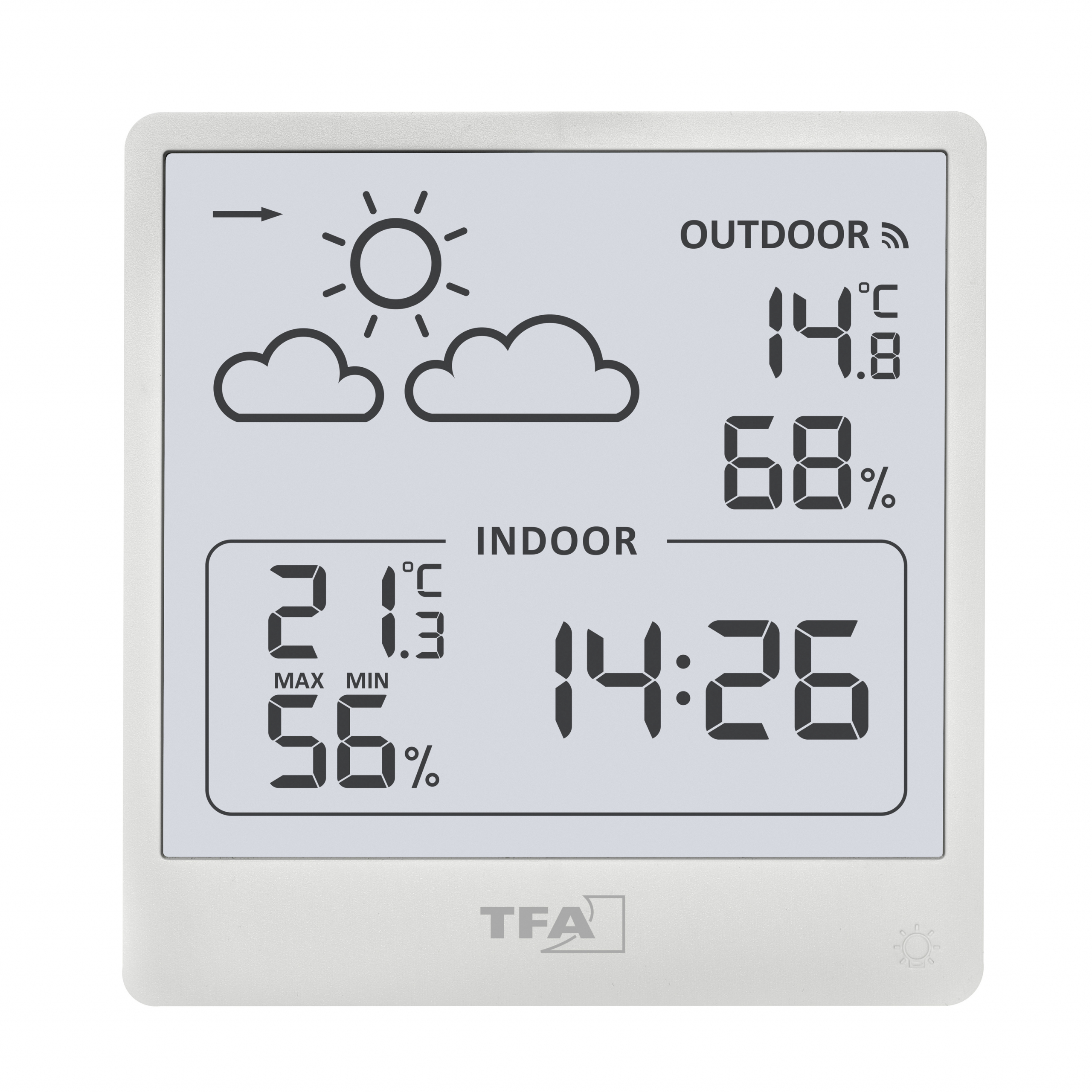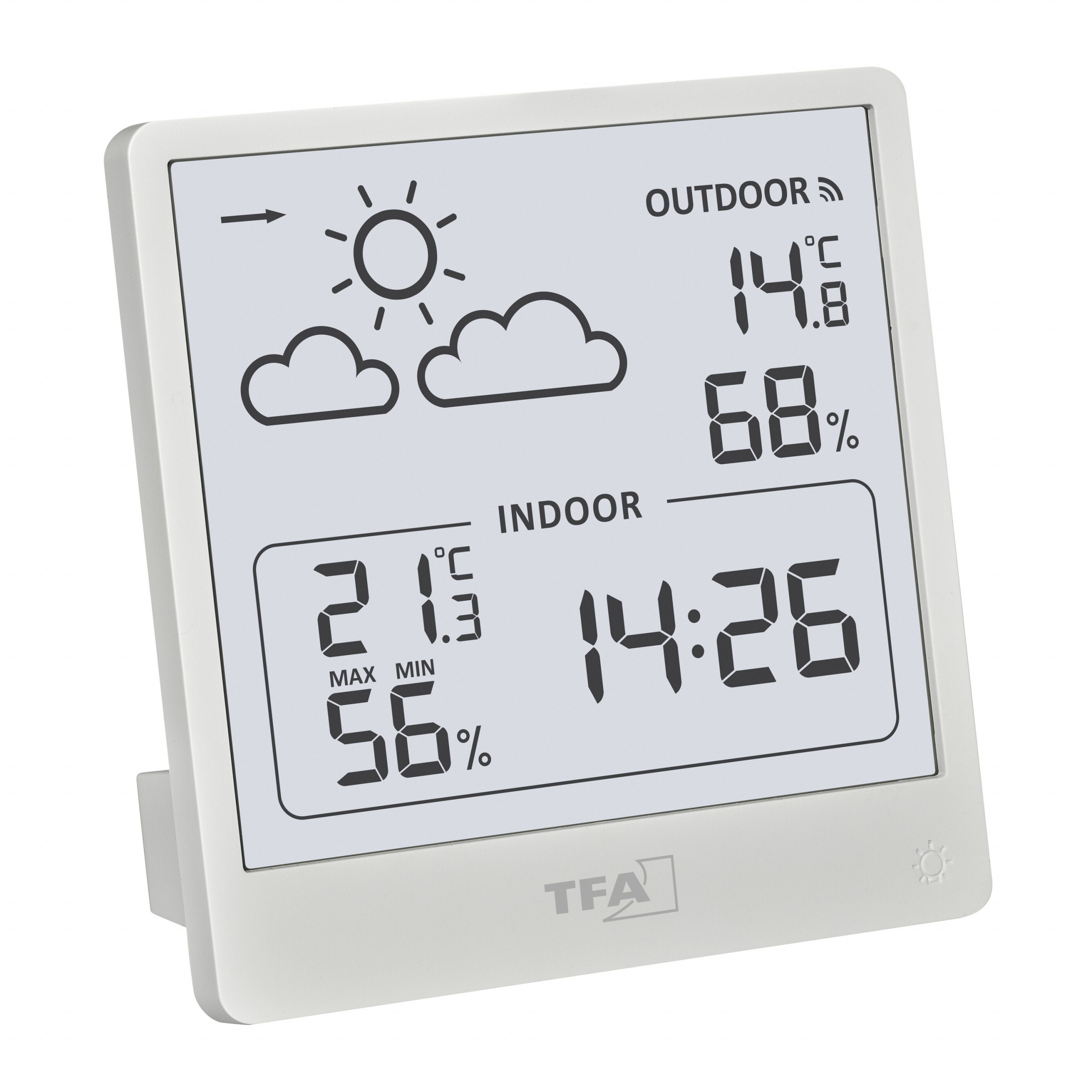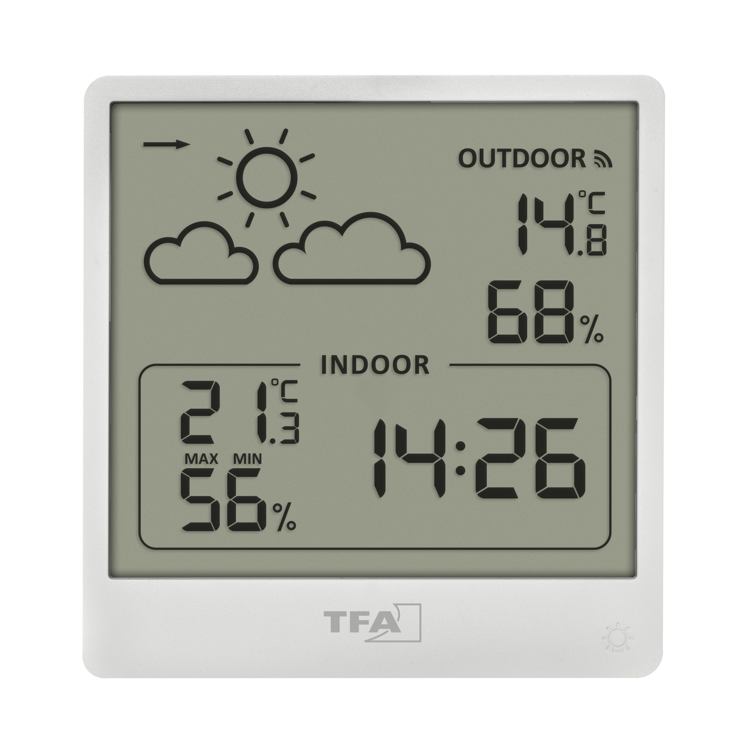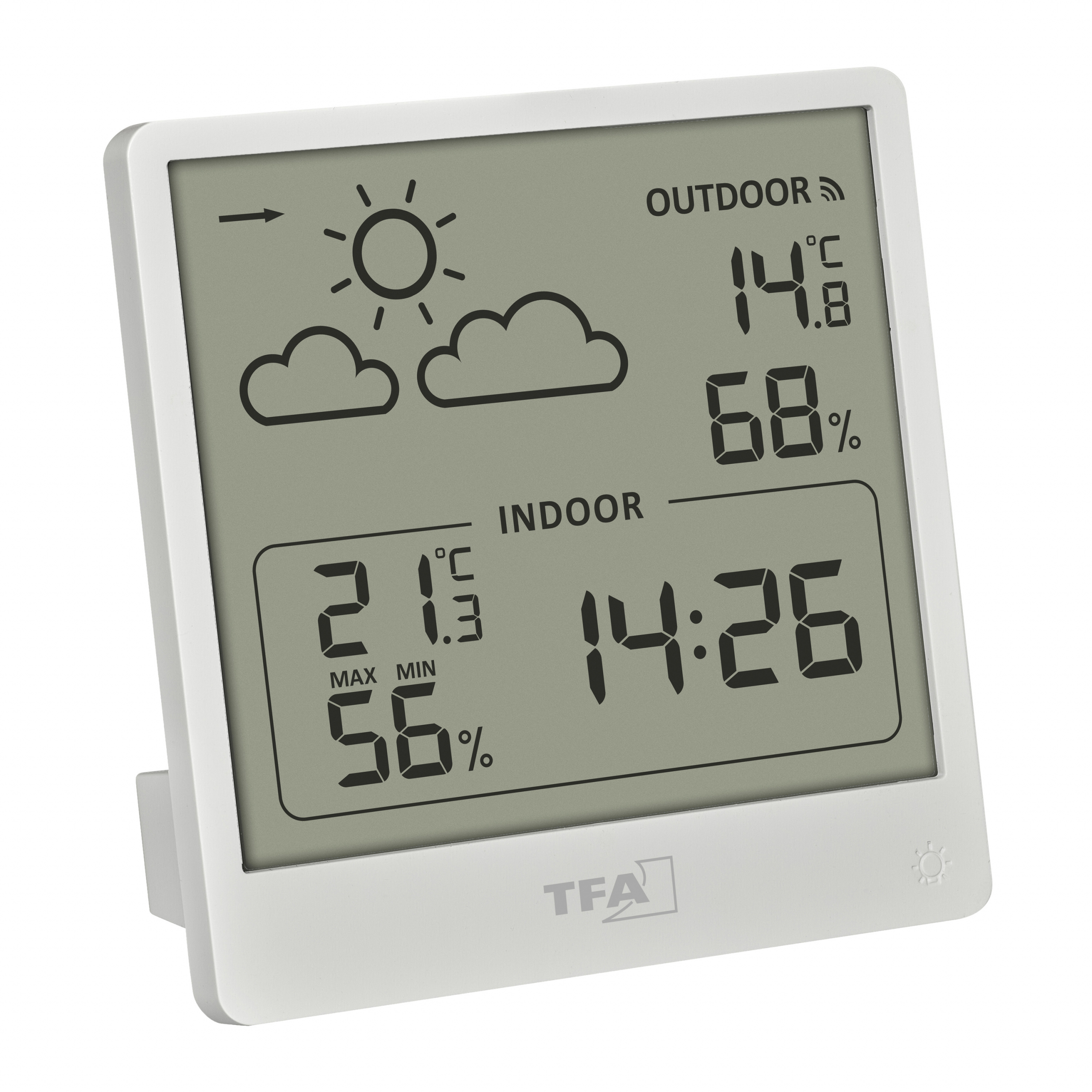 Temperatura i wilgotność zewnętrzna z nadajnika bezprzewodowego (433 MHz), zasięg do 60 m (w otwartej przestrzeni)